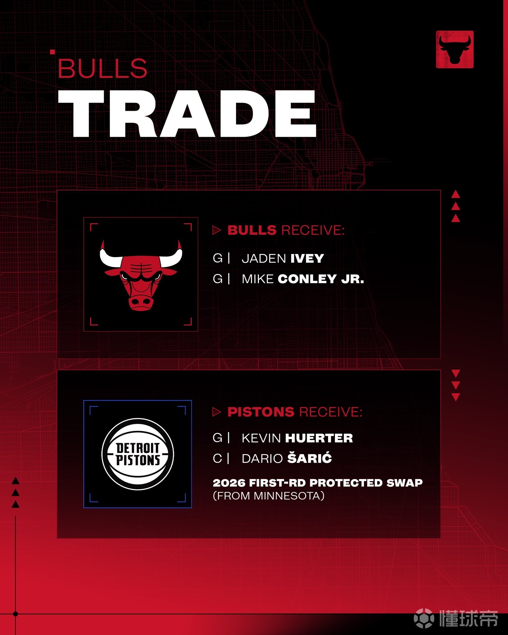 北京时间2月4日,芝加哥公牛官方宣布,球队已通过一笔涉及活塞队与森林狼队的三方交易,成功获得杰登-艾维与迈克-康利。