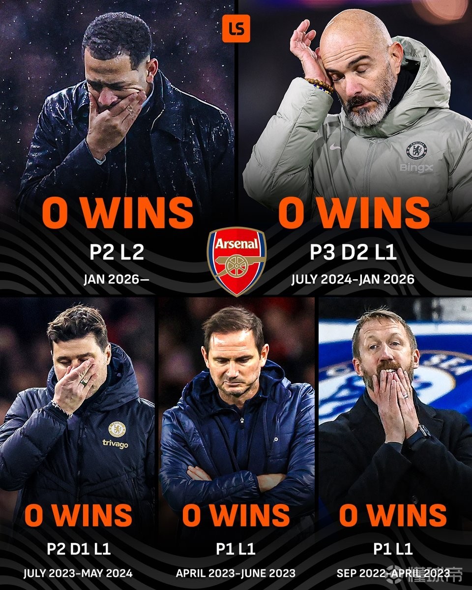 切尔西最近五位主帅对阵阿尔特塔战绩: