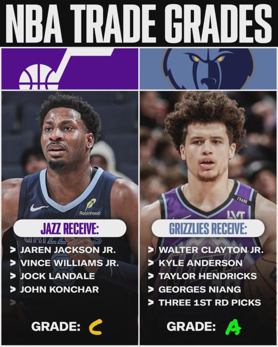 上周爵士打包小克莱顿、凯尔-安德森、亨德里克斯、乔治-尼昂和3个首轮签,7换4从灰熊得到3J、康查尔、兰代尔和小文斯-威廉姆斯。这3个首轮是:2027年首轮(爵士/骑士/森林狼最高顺位)、2027年首轮(湖人)、2031年首轮(太阳)。