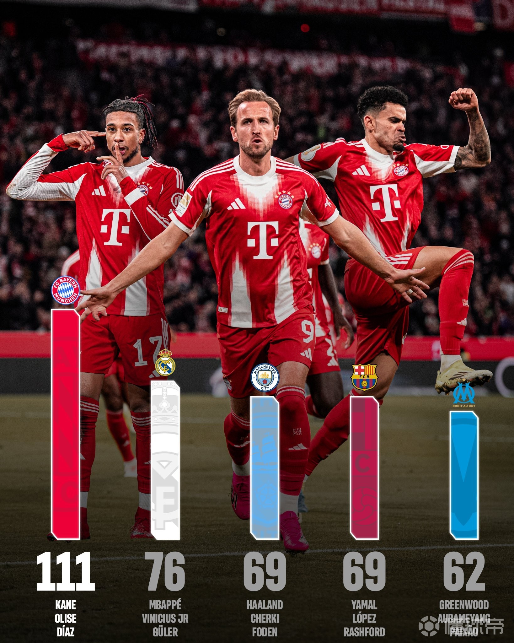 本赛季至今,哈里-凯恩、奥利塞以及路易斯-迪亚斯合计直接参与的进球数已经高达111球,同期这一数据位列全欧第一,比排名第二的皇马三叉戟姆巴佩、维尼修斯和居莱尔多出了35球。