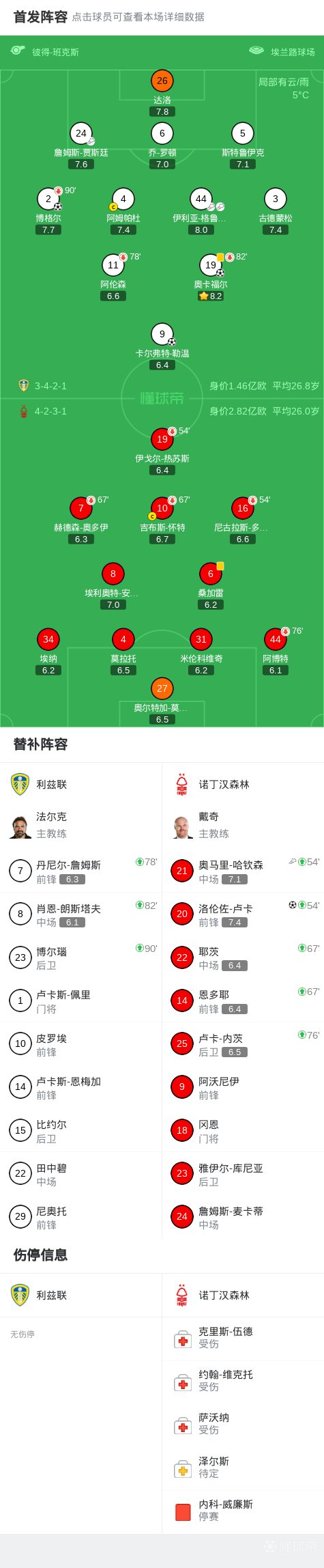 第49分钟,格鲁耶夫助攻,勒温胸部撞射破门,利兹联3-0诺丁汉森林