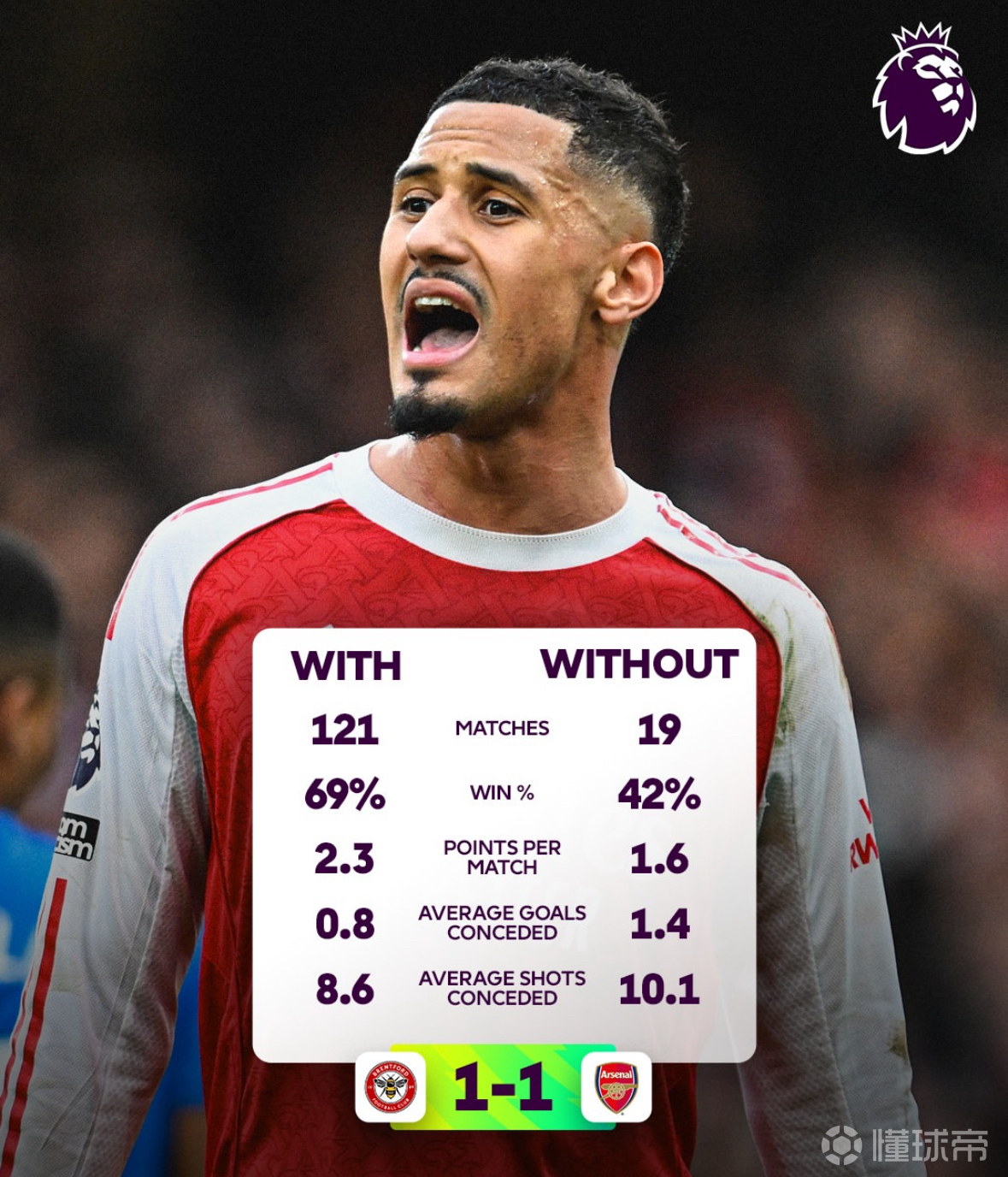 萨利巴对阿森纳的重要性:在有萨利巴的英超比赛中,阿森纳的胜率是69%,萨利巴不在的时候下降到了42%!